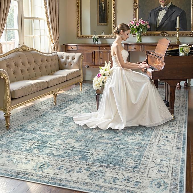 LIVEBOX Washable Area Rug 8x10 Rugs for Living Room Bedroom, Non-Slip Boho Indoor Carpet for Dining Room Office, Low-Pile Farmhouse Soft Carpets for Kids Nursery Room Playroom, Blue