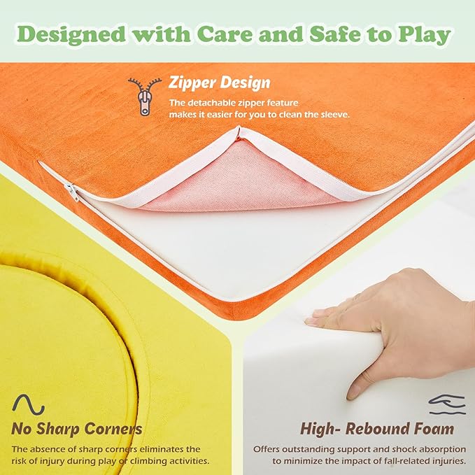 - 7 Piece Climbing Blocks Set: Our toddler climbing blocks feature a variety of shapes and colors for endless possibilities. Constructed from non-toxic and odorless fabric, with hidden zippers to prevent scratching, these blocks provide a safe and comforting environment for children to explore and play. Designed without sharp edges, the soft foam blocks protect little ones from accidents, enabling them to move and play freely.