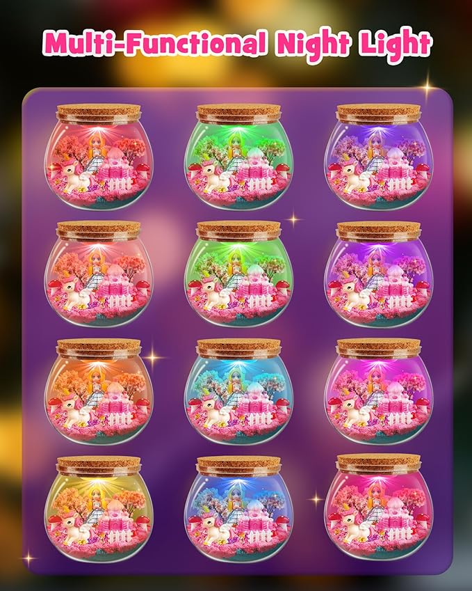 - Princess Unicorn Toy Sets: This glow and grow terrarium kit is a treasure trove for kids! It comes with magic sand, 12 colored LED night light with remote control, charming unicorn, mushroom and castle miniatures, and various decorative accessories. It's the perfect arts and crafts project for kids to create their own dream castle world