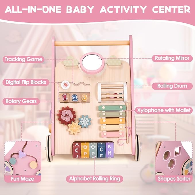 - 👧【Baby Push Walker】Our wooden baby walker is not just a reliable walker, it's also a multifunctional interactive push and pull learning activity toy. The exquisite Montessori toy design infuses it with vibrancy and joy, featuring a rotating mirror,Xylophone,Maze, Rotary Gears, Letter Rolling Ring, and Shapes Sorters for interactive play. With our activity walker, babies can enjoy hours of playtime while promoting cognitive development and hand-eye coordination in a colorful and fun environment.