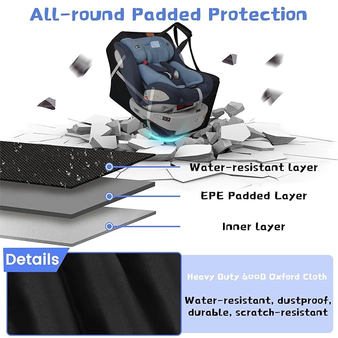 - Premium Quality: Made from heavy duty, water resistant polyester fabric, travel car seat covers for babies is easy to clean. With thick 5 Protective Bumper Feet on the bottom, padded car seat travel bag provides complete scratches protection. Car seat check bag protects baby;infant;toddler carseats from dirt, keeping baby products clean and healthy. Dual lockable zipper opening improves safety