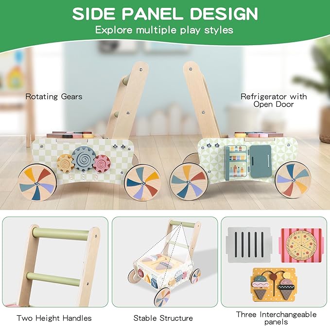 - 【MULTI-FUNCTIONAL PLAY】This activity walker is easy to install, lightweight, with vibrant colors, full of fun, and a variety of ways to play waiting for your child to explore and unlock! The wooden walker for babies designed with pizza puzzle, openable refrigerator, shape puzzles, and ice cream puzzle baby can diy make their own kebabs for food business simulation, pretending to go to the grocery store or playing a restaurant.