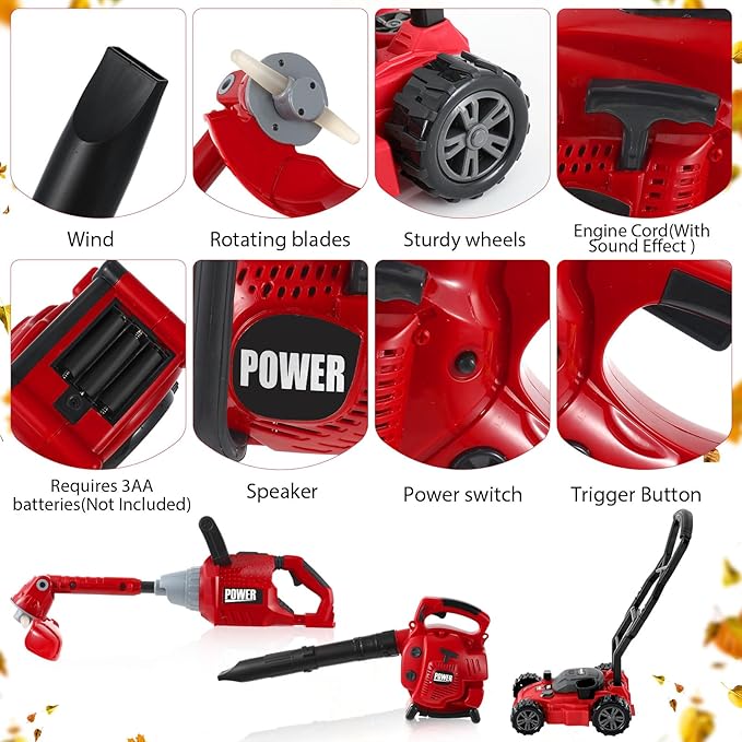 - Skill Development: through the outdoor leaf blowers set, they can practice their motor skills and enhance their eye hand coordination; The push lawn mower set requires focused concentration, hence improving their ability to stay focused while at play