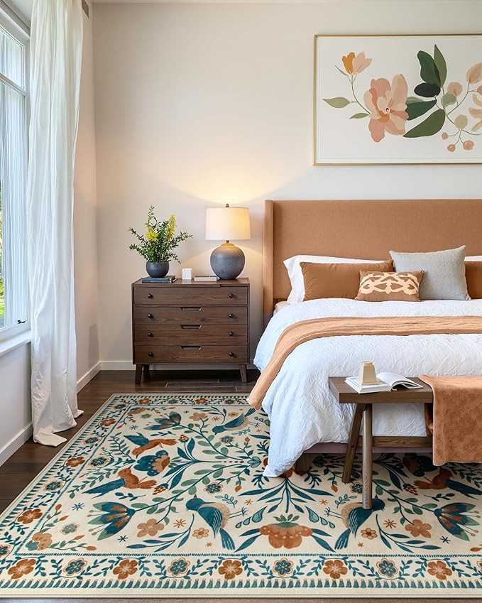 - [Bright and Elegant Design]: Featuring a beautiful bird and flower pattern with bright, vivid colors, this rug adds a touch of elegance and charm to any room, effortlessly complementing a variety of décor styles