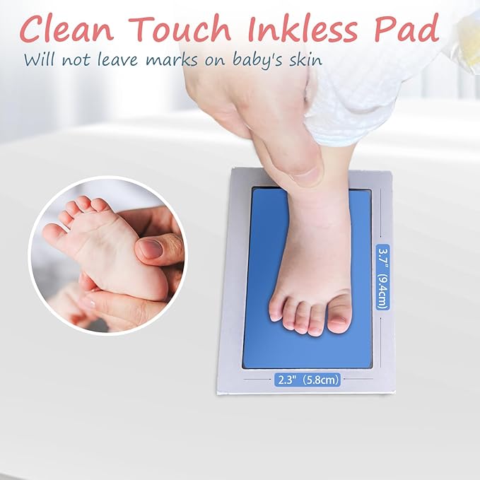 • [Perfect Gifts]: This baby ink hand and footprint kit measures 5.0"x3.2" and has an ink window of 3.7"x2.3".Ideal for newborn baby hand and footprint, use the baby inkless ink pad, you will have personalized baby footprint keepsake, it's not only for baby shower gifts but also for pet birthday gifts.