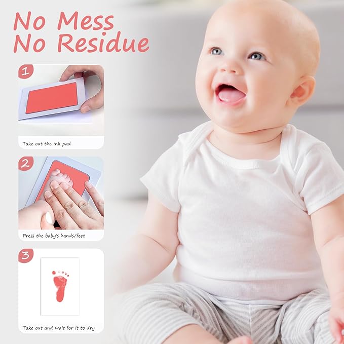 - [No Mess,No Residue]:This inkless baby hand and footprint kit is clean touch and no residue. Use this baby hand and footprint kit,you will get clear, complete, non-blurred baby handprint.This mess free ink pad for babies is perfect as baby shower gifts for newborn baby.