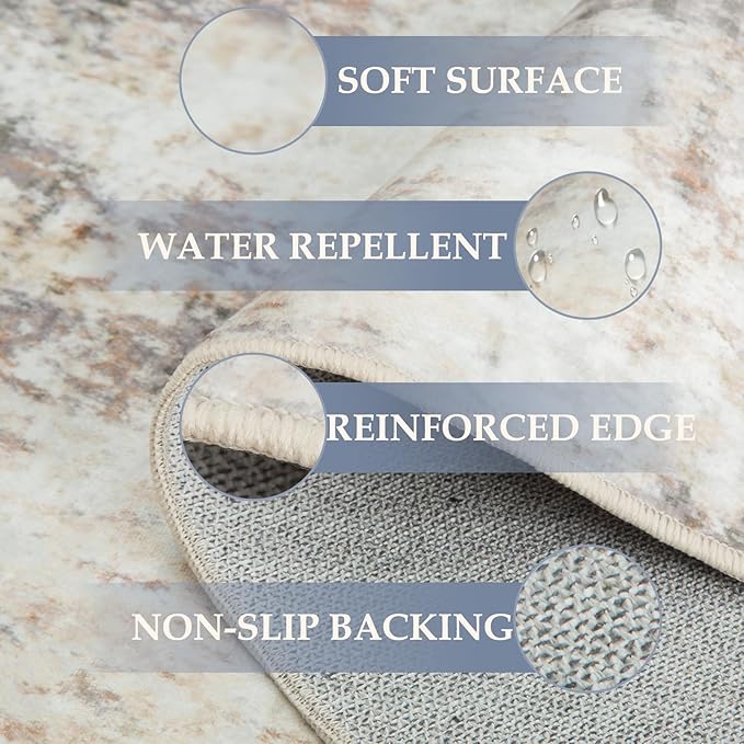 - Tides Series – Effortless style that flows with your life.This modern machine-washable non-slip rug features reinforced edges and a low-pile design that resists dirt. Its water-repellent surface makes spills easy to clean - liquids bead up for quick wiping. Simply machine wash in cold water (no bleach) to refresh. The non-slip backing keeps it securely in place. A perfect blend of function and contemporary design for active homes.