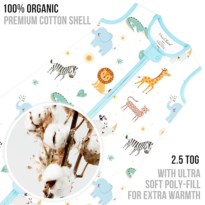 - 【MADE WITH ORGANIC COTTON】— The Mama Cheetah 2.5 TOG Baby Sleeping Bag is made of premium 100% organic cotton shell, with ultra soft polyester fill for extra warmth, which is perfect for cooler months. The organic cotton interlock minimizes the risk of overheating and keeps your baby warm and comfortable. Please be mindful of the TOG rating when ordering the right sleeping bag for your baby.