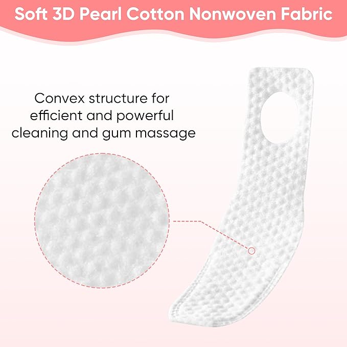 - đăHigh-quality MaterialsăOur baby oral cleaner is made of soft 3D pearl cotton non-woven fabric, which is softer than gauze material and has stronger cleaning power. ⼠Using ultrasonic stitching technology, no glue, no chemicals, and will not split. And the bump structure provides efficient and strong cleaning, strong adhesion and better cleaning effect.