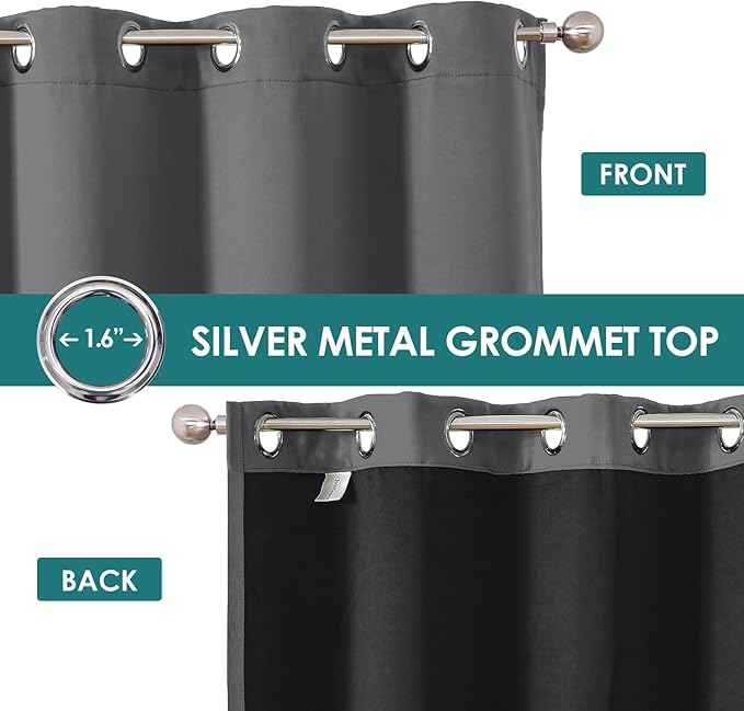 - SET DETAILS: Set of 2 total blackout curtain panels per package. Each lined curtain measures 38 inch wide by 84 inch long with 6 silver metal grommets (1.6 inch inner diameter) on top, easy to install and slide.