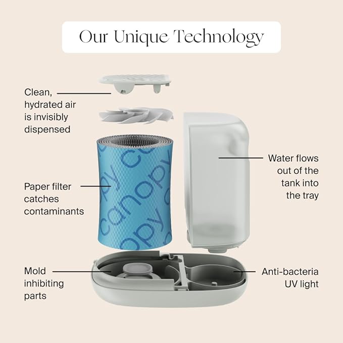 - THE HEALTH BENEFITS OF HUMIDITY: The Canopy Humidifier helps optimize your living space to have the ideal level of humidity. Ensuring proper humidity helps to hydrate skin; combating dryness, dullness and fine lines & wrinkles. Increased skin barrier function to protect from pollution. Alleviate cough, nasal congestion and other symptoms of cold, flu and allergies. Provide clean and safe aroma diffusion for a calming environment