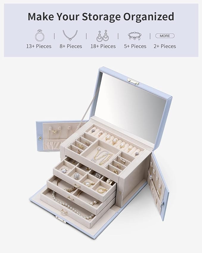 - [Spacious & Multifunctional] This large jewelry box has 4 layers. The first layer has a row of ring slots, 6 earring boards, and a large grid for bracelets. The second layer has 12 small grids for storing earrings and brooches. The third layer has 4 large grids for bracelets and bangles. The fourth layer is for larger necklaces. Additionally, there are 8 necklace hooks on both sides of the jewelry box, and the hook design prevents necklaces from tangling with each other.