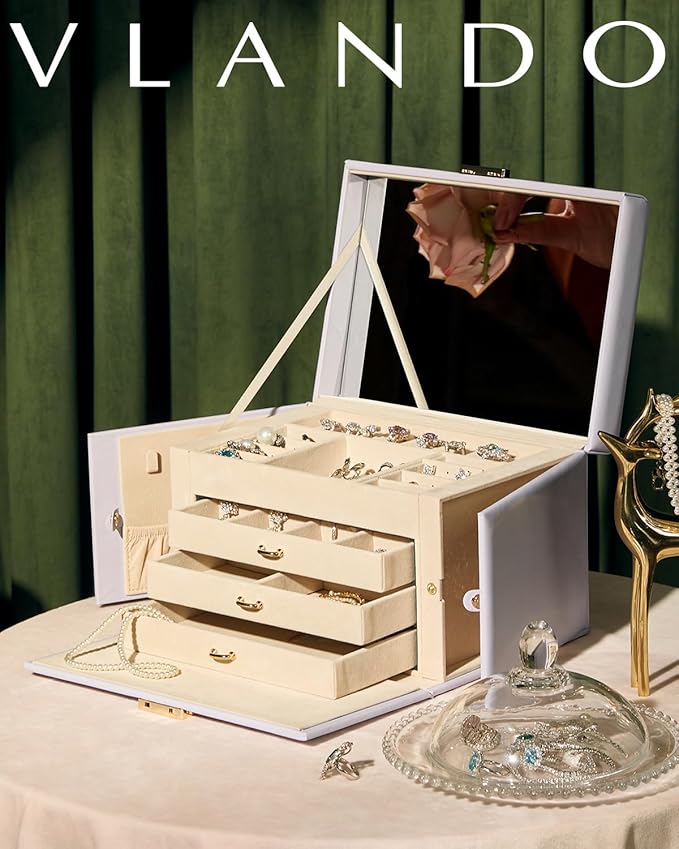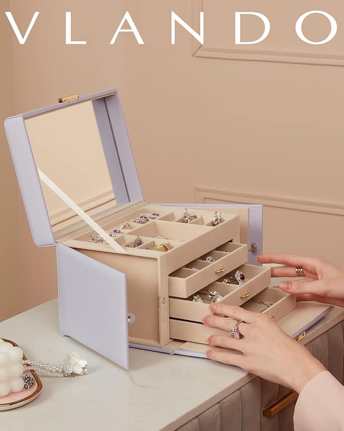- [Soft Material & Mirror] The exquisite and glossy leather material gives the jewelry box a more premium appearance, while the soft velvet interior provides better protection for your jewelry. This jewelry box also comes with a mirror, making it convenient for makeup needs when you're on the go.