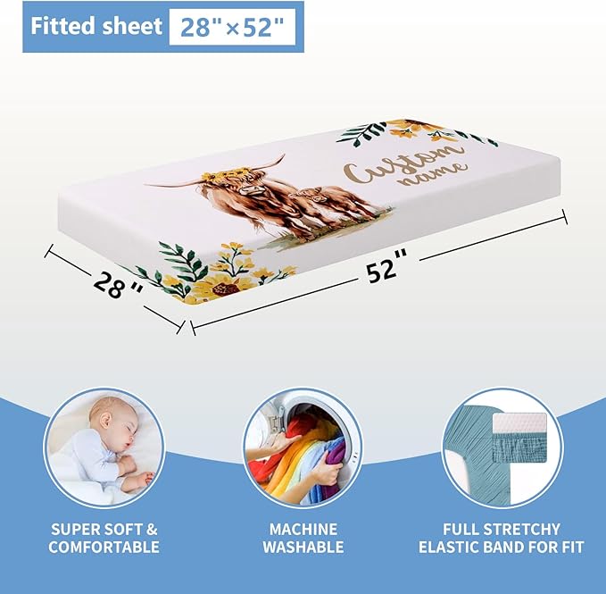Personalized Baby Crib Bedding Set, 5 Pcs Custom Name Bedding Set, Double Layer Nursery Bedding Set for Boy Girl, Highland Cow Baby Crib Set, Gift for Toddlers Infants New Parents