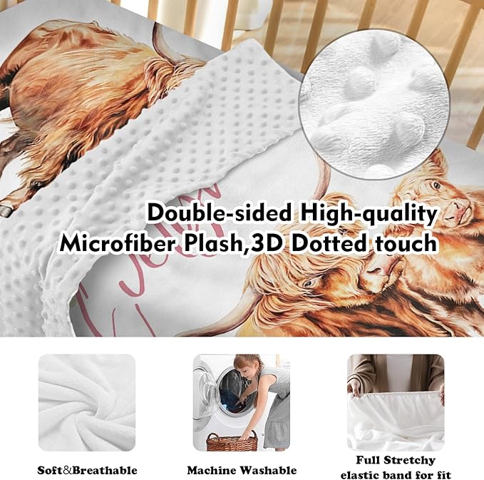 Personalized Nursery Crib Bedding Set: Custom Name Floral 5 Piece Baby Crib Sets with Highland Cow Design - Toddler Double Layer Blanket Set, Comfortable Crib Bed Sheets for Baby Grils