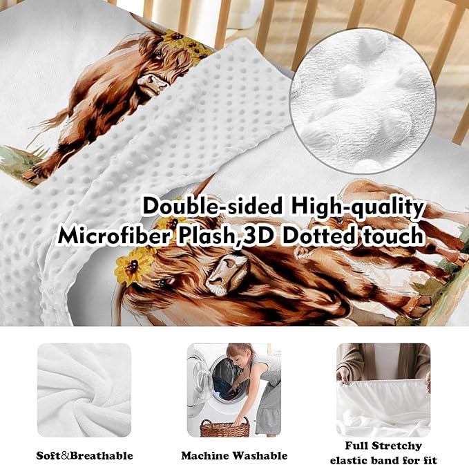 Personalized Nursery Crib Bedding Set: Custom Name Yellow Floral 5 Piece Baby Crib Sets with Highland Cattle Design - Toddler Double Layer Blanket Set, Comfortable Crib Bed Sheets for Baby Grils
