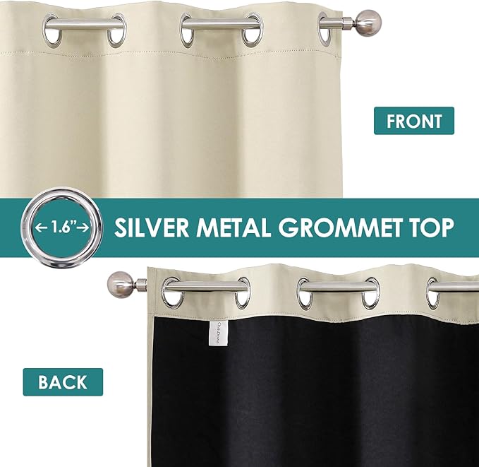 - SET DETAILS: Set of 2 total blackout curtain panels per package. Each lined curtain measures 42 inch wide by 45 inch long with 6 silver metal grommets (1.6 inch inner diameter) on top, easy to install and slide.