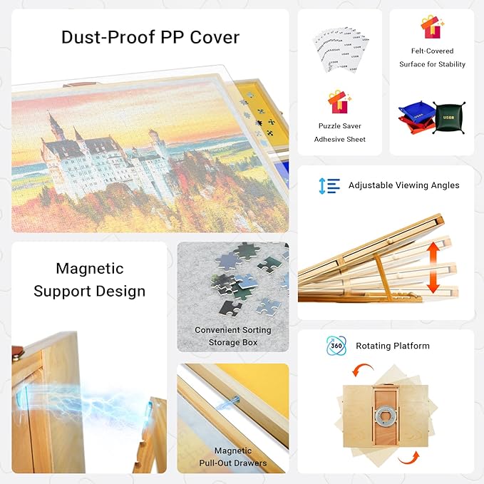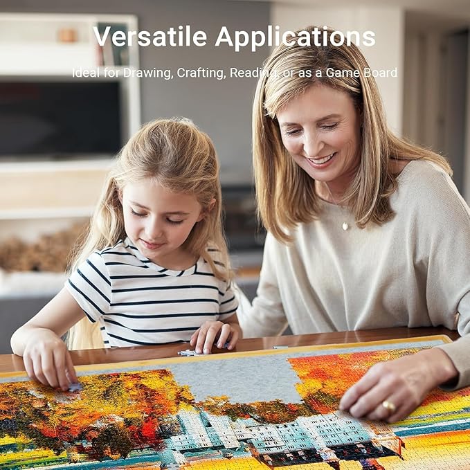- 🧩 Stable Surface, Even When Tilted: A multi-layer composite suede mat keeps pieces secure, offering far better grip than traditional felt—ideal for 1000–1500 piece puzzles on any incline.