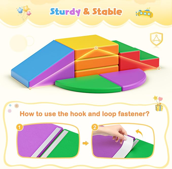 - 🧠 "Fun & Skill Development Combination" Our toddlers climbing toys have a variety of shapes and colors which capture children's interest and help them develop color recognition skills. Children can stack the blocks to learn about shape, and spatial relationships, helps your baby develop his intelligence