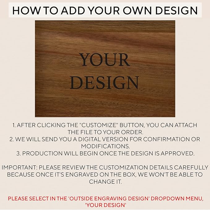 - Customizable: this acacia wood memory box for girls can be engraved with various designs offered create your own memory box by adding a name or text to make it unique. We’ll use the font style showcased in the photos. Additionally, it can be engraved inside(different font options), on the other lid's side, to create a surprise message for the recipient