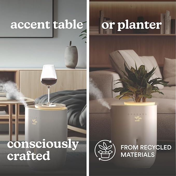 - Style + Substance: The sleek, modern design effortlessly blends into any decor with smooth surfaces and a touchscreen interface, and is consciously crafted with recycled materials. The tabletop can be removed so the humidifier can be used with your favorite 6” small plant.