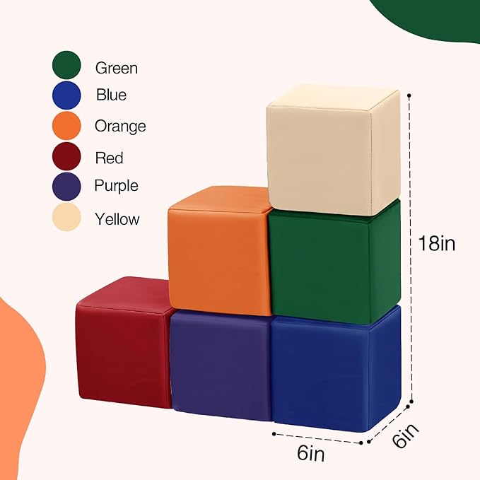 - Colorful Foam Blocks for Early Learning: Our 6-piece toddler blocks of foam cubes covered in durable, waterproof PU leather features vibrant colors designed to grab kids’ attention and foster early color recognition, creating a vibrant toddler zone to explore and learn through stacking, building, and imaginative adventures