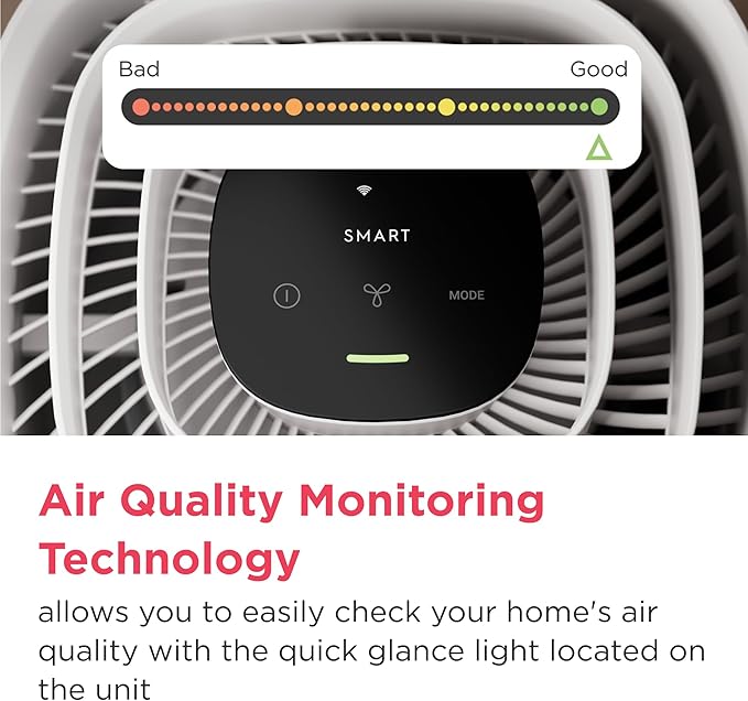 - Smart Air Quality Monitoring: The built-in light indicator lets you easily monitor your home’s air quality at a glance, while Smart Mode automatically adjusts settings based on air quality changes