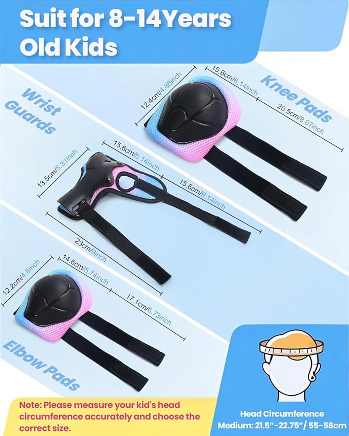 - 7PCS Kids Helmet and Protective Gear Set - Includes 1 adjustable helmet, 2 knee pads, 2 elbow pads, and 2 wrist guards—everything your child needs for safe riding. Built with a tough, scratch-resistant PP shell and cushioned interiors for long-lasting protection and comfort.