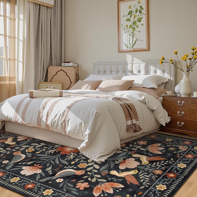 - [Bright and Elegant Design]: Featuring a beautiful bird and flower pattern with bright, vivid colors, our Moynesa rug adds a touch of elegance and charm to any room, effortlessly complementing a variety of décor styles