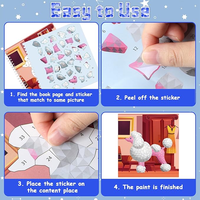 - Easy to Use: Uncover the ideal match of book pages and stickers for every image in our sticker by number books. Easily peel off the cartoon stickers and carefully place them on the designated numbers within the book to unveil a masterpiece of your own making.
