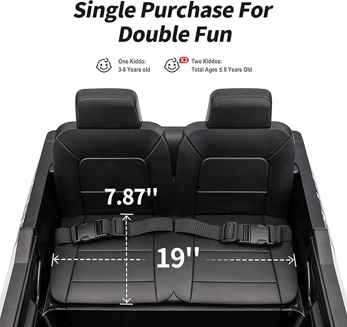 - 19" DUAL SEATER : This battery powered police kids car has ample seater, allowing two children to ride together comfortably under 110lbs. Adjustable seat belts and double-locking door design also ensure kid's safety.