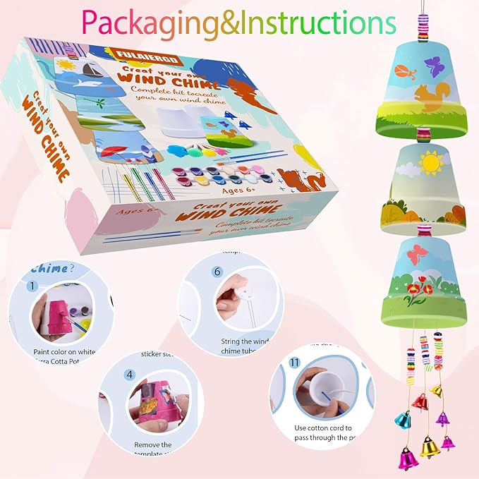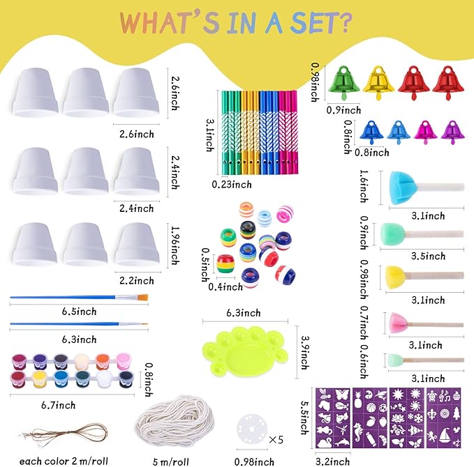 - 【DIY Wind Chime Kits Includes】Our wind chimes for kids includes: 9 big Terra Cotta Pots in 3 sizes, 12 Wind Chime Tubes, 5 Felt pads, 2 rolls cord lines, 12 colors paints, 2 brushes, 45 colored wood beads with holes , 5m cotton cord, 5 sponge stick, 4 stencil,8 color bells ,1 palette,1 instruction manual.Please refer to the product video for detailed operation steps