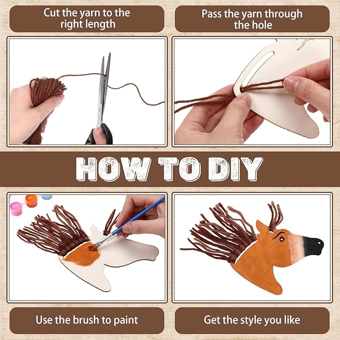 - 24 Set Wooden Horse Cutout Kit: unleash your imagination with this complete wooden horse craft kit; It includes 24 unfinished horse cutouts, 2 sets 12 color paints, 4 paintbrushes, 8 rolls of yarn in different colors, ready to be transformed by your creativity