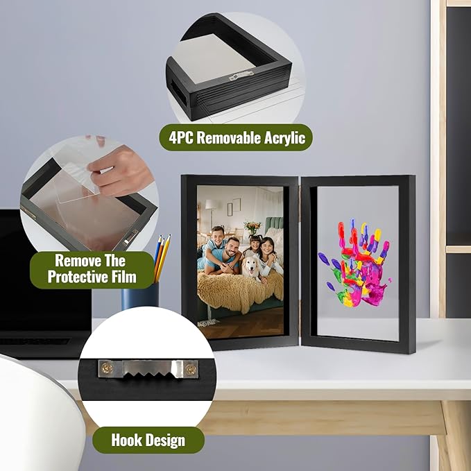 - 【DIY GIFT KIT】This baby hand and footprint kit comes with a custom black folding frame (Can store 1 or more family photos according to your needs), 4 transparent sheets (warm reminder: peel off the protective film of each transparent sheet before use.), 5 types Washable paint (red, yellow, blue, white, green), 1User Manual, a brush, a Hanging twine and a black marker. Assembled dimensions: 7.7" x 2.4" x 11.2"