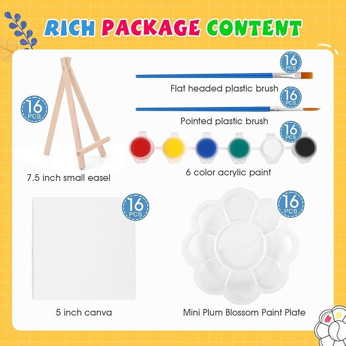 - 【Multi group art set】: 16 Set small acrylic painting kit have 16 mini stretched canvas (5*5 inch), 16 wooden mini easels (7.5 inch), 16 acrylic paint strips,16 flat paint brushes, 16 round pointed brushes and 16 plastic art plates. One set contains all, very suitable for kids, adults, art workshops, paint classes, art nights, valentines painting gifts, and paint parties.