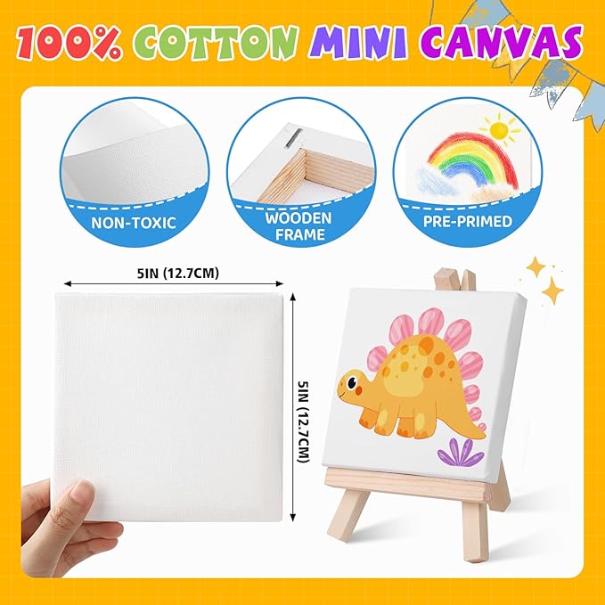 - 【 Mini stretched canvas and easel】: The 16 set mini acrylic paint set provide 5 x 5 inch small canvas with 7.5 inch mini wooden display easel. Kids can show their creations anywhere. Our mini canvas are safe and non-toxic, making them perfect for kids to use. These small easels are sturdy,can be used to hold photos, phones and more.