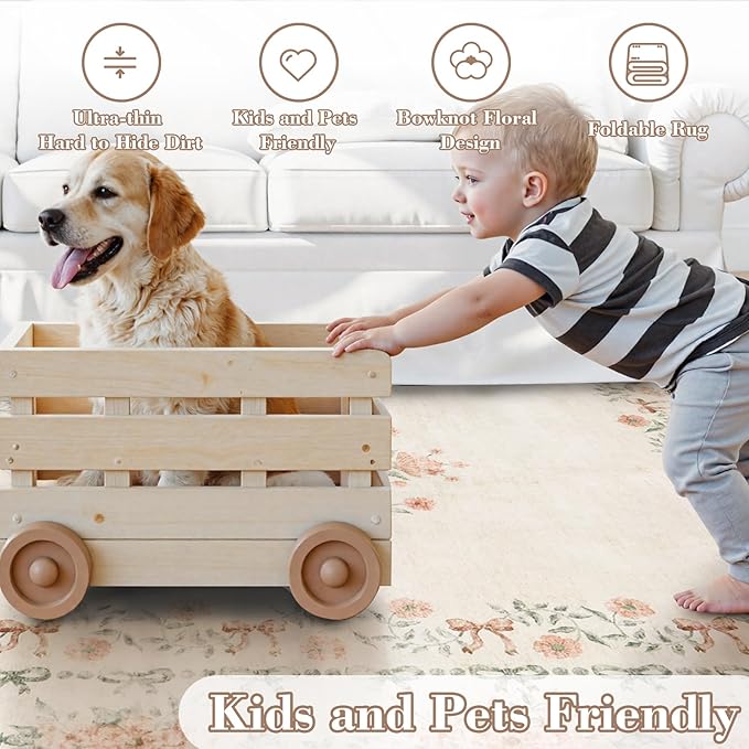 Wonnitar Floral Bow Print Washable 8x10 Rug, Beige Rugs for Living Room, Boho Non Slip Ultra-Thin Soft Neutral Carpet for Nursey Kids Room Dorm Living Room, Beige