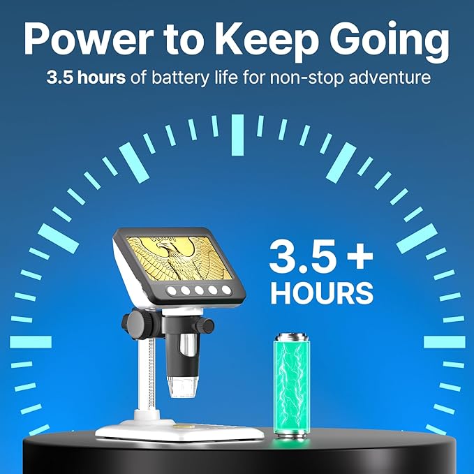 - Rechargeable Battery: WKR digital microscope is powered by a rechargeable battery (3.5 hours of working time) or directly via USB. Truly portable and independent. On a sunny day you can take your family or children to explore the magical and colorful miniature world.