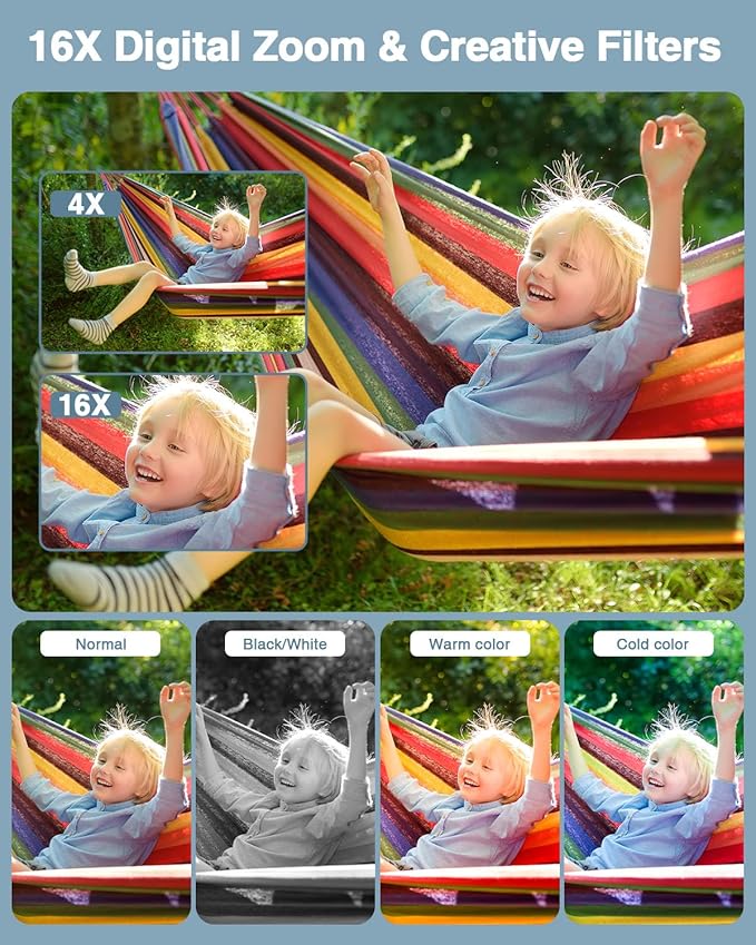- SAFE MATERIALS & CREATIVE FILTERS - Made of high-grade and eco-friendly reliable materials, the kid camera is safe and non-toxic, durable and withstands drops. This digital vlogging camera for teens also supports six cute filter effects to choose from, kids could create more adorable colorful pictures.