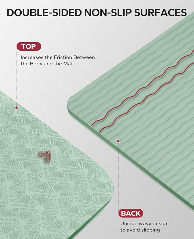 - sided non-slip surface to keep you stable and secure during your practice without worrying about slipping or sliding. The unique wave pattern on the bottom enhances grip on a variety of surfaces, ensuring your mat stays securely in place even during the most challenging yoga poses. (Not for use on carpet)