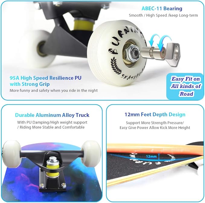 - 【EASY TO RIDE】 31 ” Complete Skateboard, with PU flashing wheels (will light up when you use ) make you safe when you ride in dark place and 8”wide non-slip dull polish wooden deck can not only provide more stability and safety for users but also hold both foot on it . Hold weight up to 224lbs, which can suitable for all kinds of people.