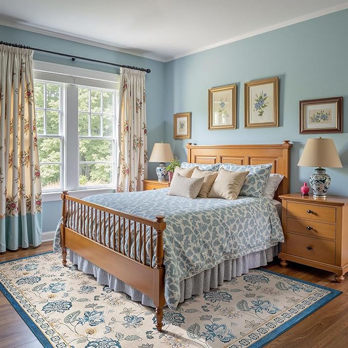 jinchan 8x10 Floral Rug for Living Room Washable Bedroom Rug Vintage Romance Design Non Slip Thin Indoor Floor Cover Large Low-Profile Throw Carpet for Dining Room Office, Blue/Beige