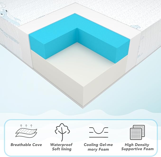 - Premium Memory Foam Crib Mattress – Made with high-density foam and cooling gel memory foam, this pack and play mattress topper supports your baby’s spine, head, back, and legs—promoting restful, comfortable sleep at every stage.