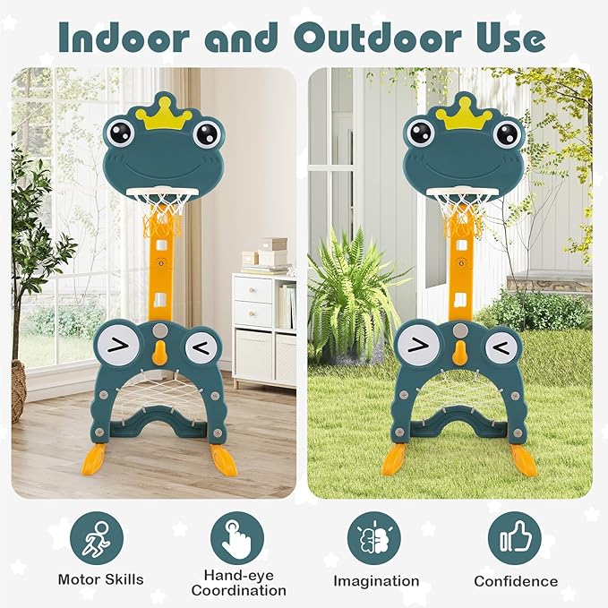 Costzon Toddler Basketball Hoop, 4-in-1 Kids Sports Activity Center with Rim, Soccer Goal, Golf, Ring Toss, Height Adjustable Kids Basketball Hoop with Fillable Base for Indoor Outdoor (Green Frog)