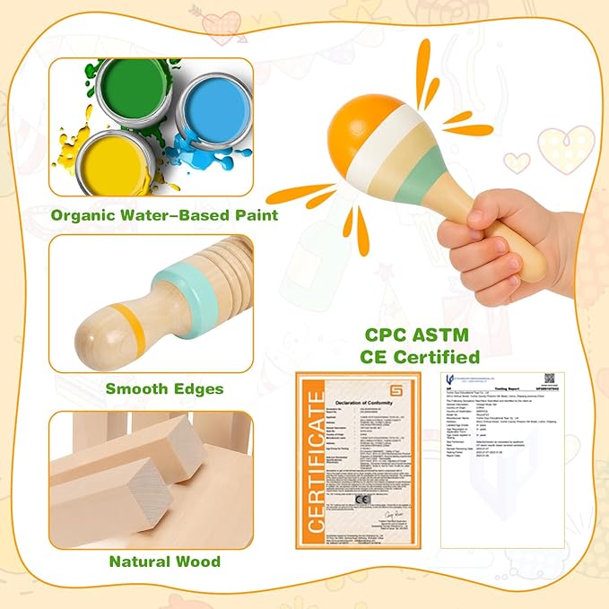 - 🌱 Child-Safe Montessori Toys for Toddlers 1-3- Our baby musical instruments are made from natural wood & non-toxic water-based paints. The montessori instruments for toddlers are CPC/ASTM certified. The montessori baby toys come with Smooth edges, no splinters, and baby-safe construction ensure worry-free play. Ideal toddler musical instruments for 1 2 3 Year Old, BPA-free and easy to clean.