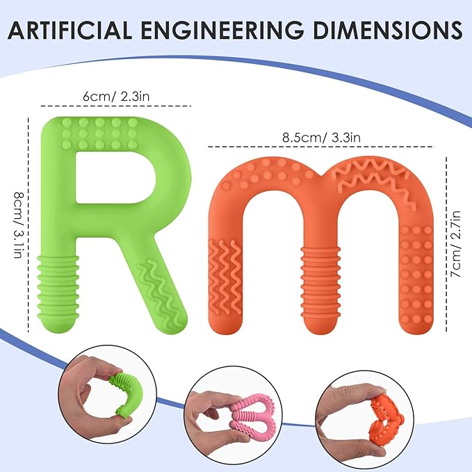 - Multi scenario use: Our sensory teething toys set includes 2 pcs R shaped and 2 pcs M shaped sensory chewy toys. Children with autism, ADHD, and sensory processing disorders can use chew toys at home to help relax and concentrate, as auxiliary tools in the classroom to promote learning and development, and as part of sensory training during treatment
