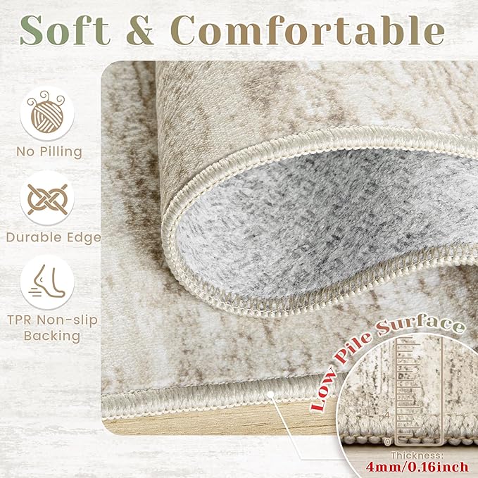 Washable Rug 9x12 Area Rugs for Living Room: Large Neutral Soft Rug Abstract Non Slip Low Pile Modern Carpet for Bedroom Kitchen Nursery Office Dining Room Indoor (Beige, 9'x12')