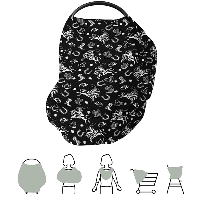 Country Western Car Seat Cover for Baby Cowboy Hat Boots Horse Cactus Stretchy 5-in-1 Covers Adjustable Car Canopy Breastfeeding Cover Wild West Desert Breathable Nursing Cover-Up