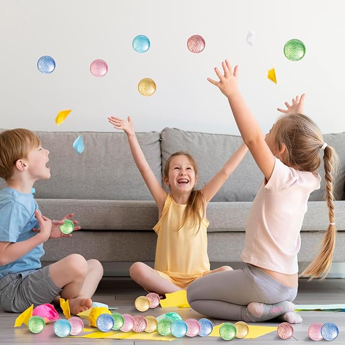 - Brightly Colored & Easy to Carry: Each glittery bouncy ball comes in bright, eye-catching colors with sparkles inside. These bounce balls are lightweight and compact, making them easy to put in backpacks, pockets, or goodie bags for on-the-go fun