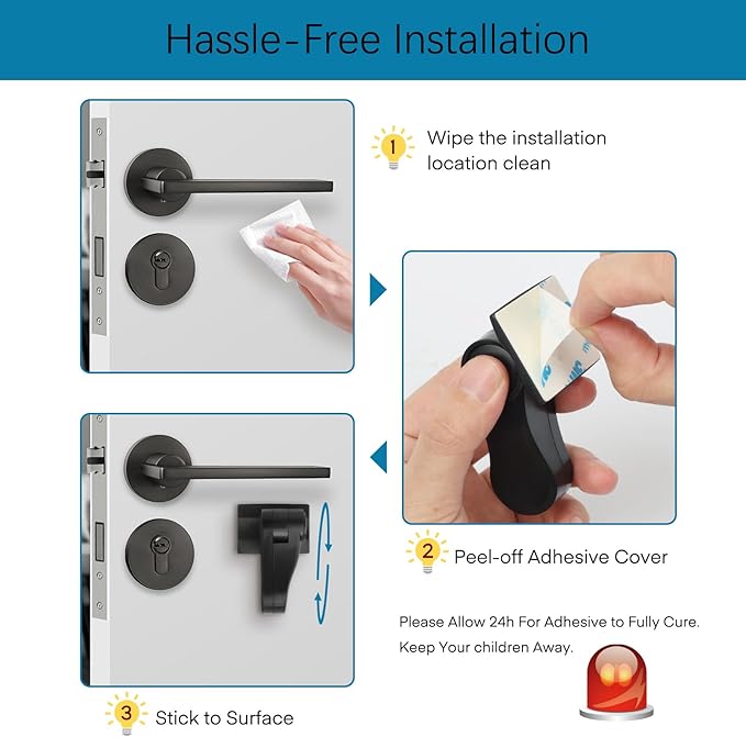 - Easy to Install and Remove: No need tools. Peel the damage-free 3M adhesive and place the Baby Safety Door Handle Lock on the door. Use hair dryer will help you remove the lock without any residue